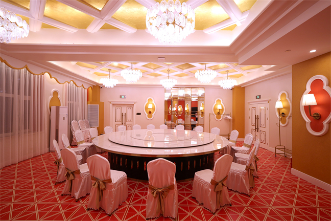 皇宮廳—金碧輝煌、皇宮式裝修,面積1038㎡,層高8.6米,配備愛(ài)情階梯、軌道威亞、二層觀(guān)禮臺(tái)、浪漫燈光秀、旋轉(zhuǎn)升降舞臺(tái)、頭頂天幕連接開(kāi)合大屏??沙薪?0桌的大型宴會(huì),也可舉辦600人的大型會(huì)議;還可用作會(huì)展、車(chē)展場(chǎng)地,每逢節(jié)假日還為市民上演文藝節(jié)目。